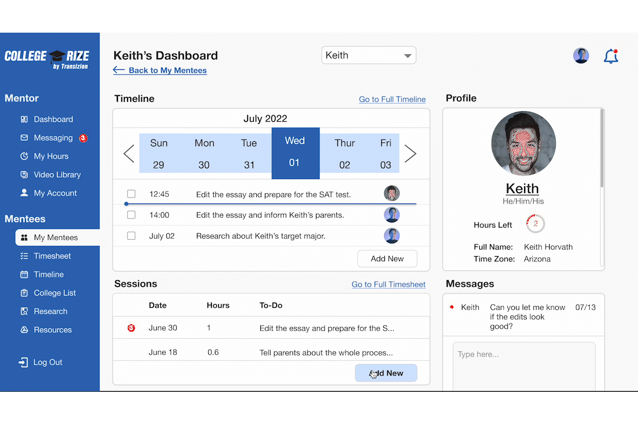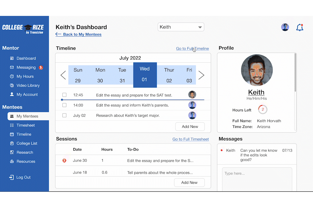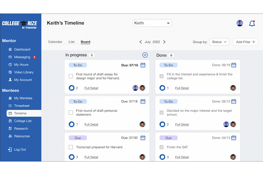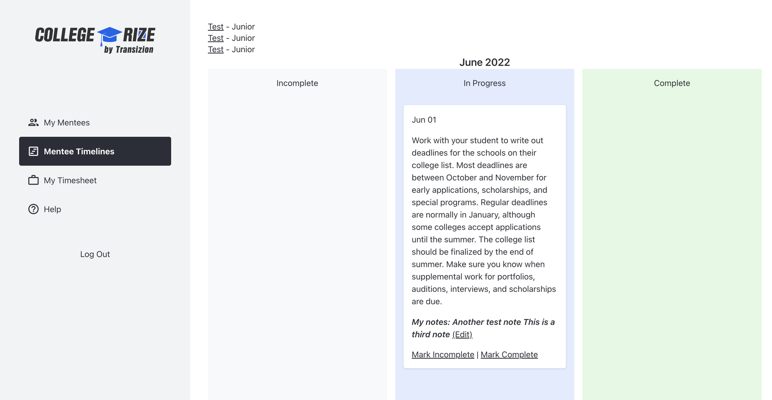 Transizion needs a way to keep track of each mentor-mentee pair’s process. They launched the Collegrize V1.0 with a feature called “Timeline” for mentors to plan their students’ journeys.