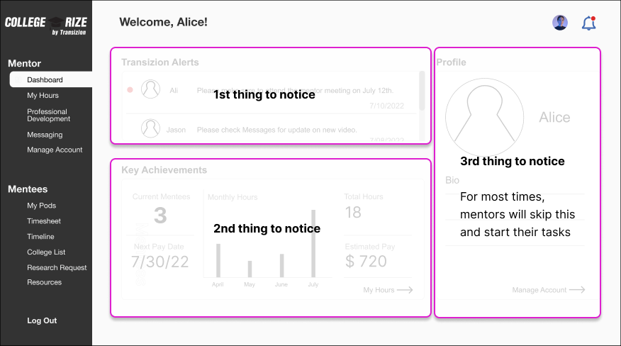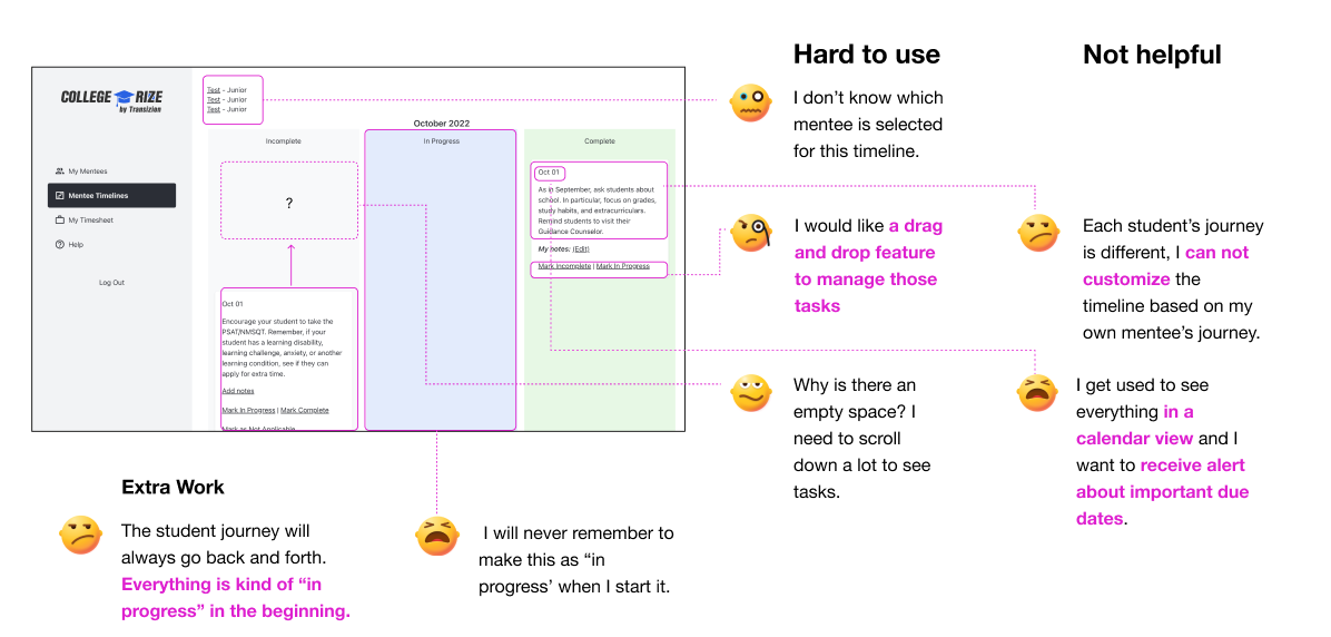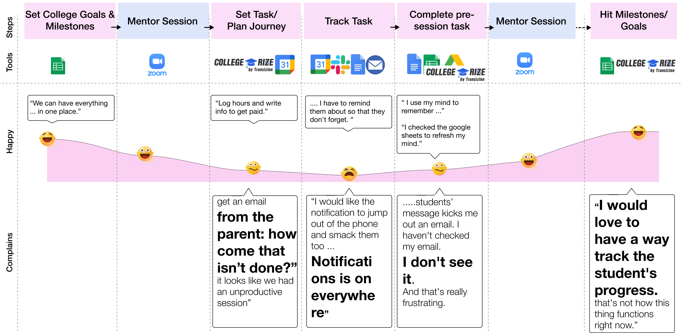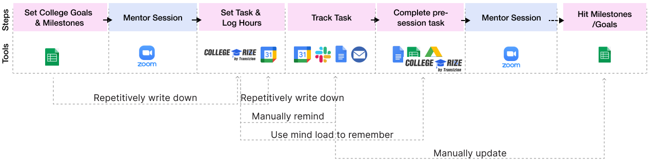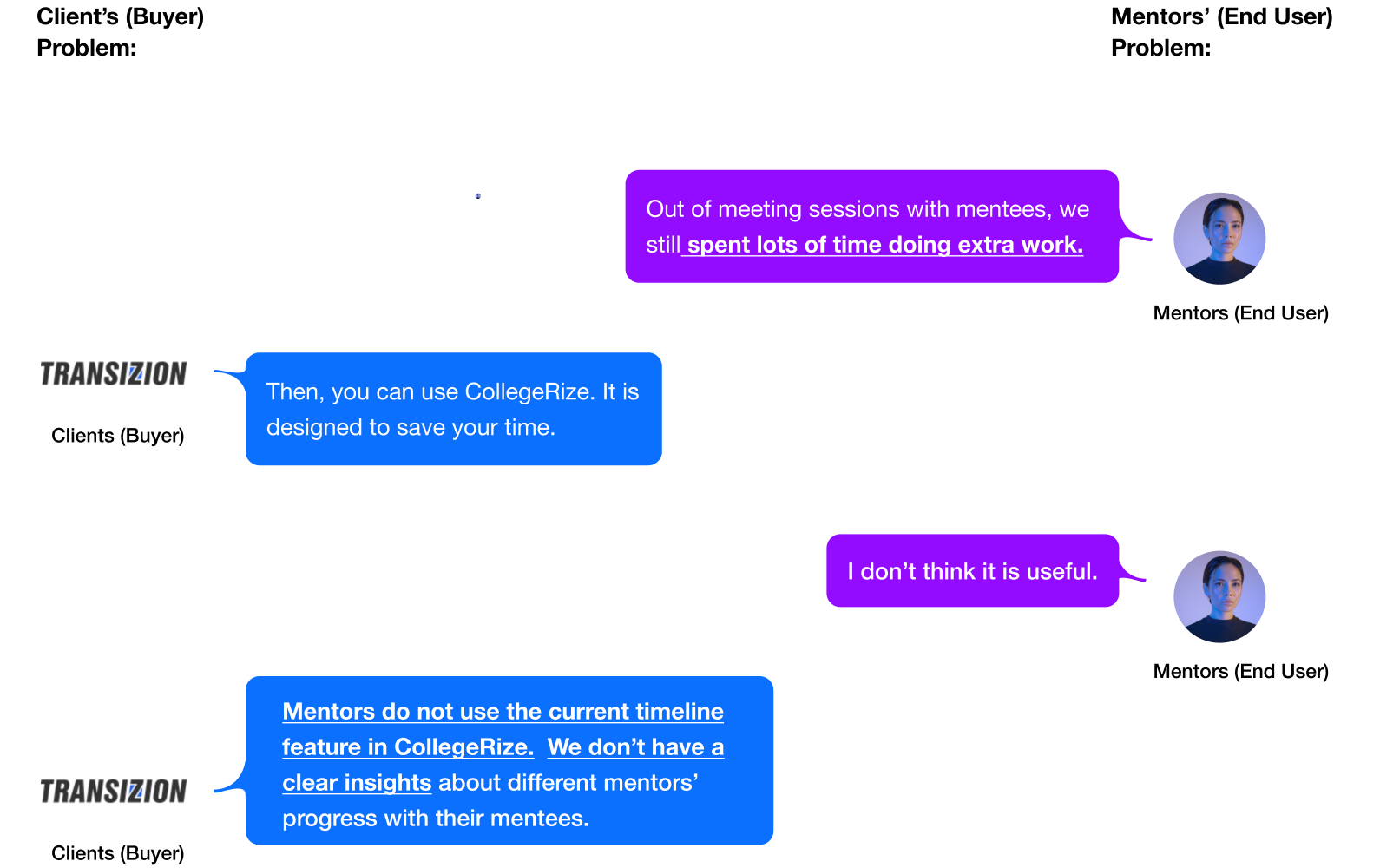 Back to the key initial challenge, Transizion (The company) hopes their mentors complete their off-session work via CollegeRize so that they can have clear insights into different mentor-mentee processes. On the other hand, mentors want to spend less time ineffectively doing off-session work so that they can have more mentees at once.