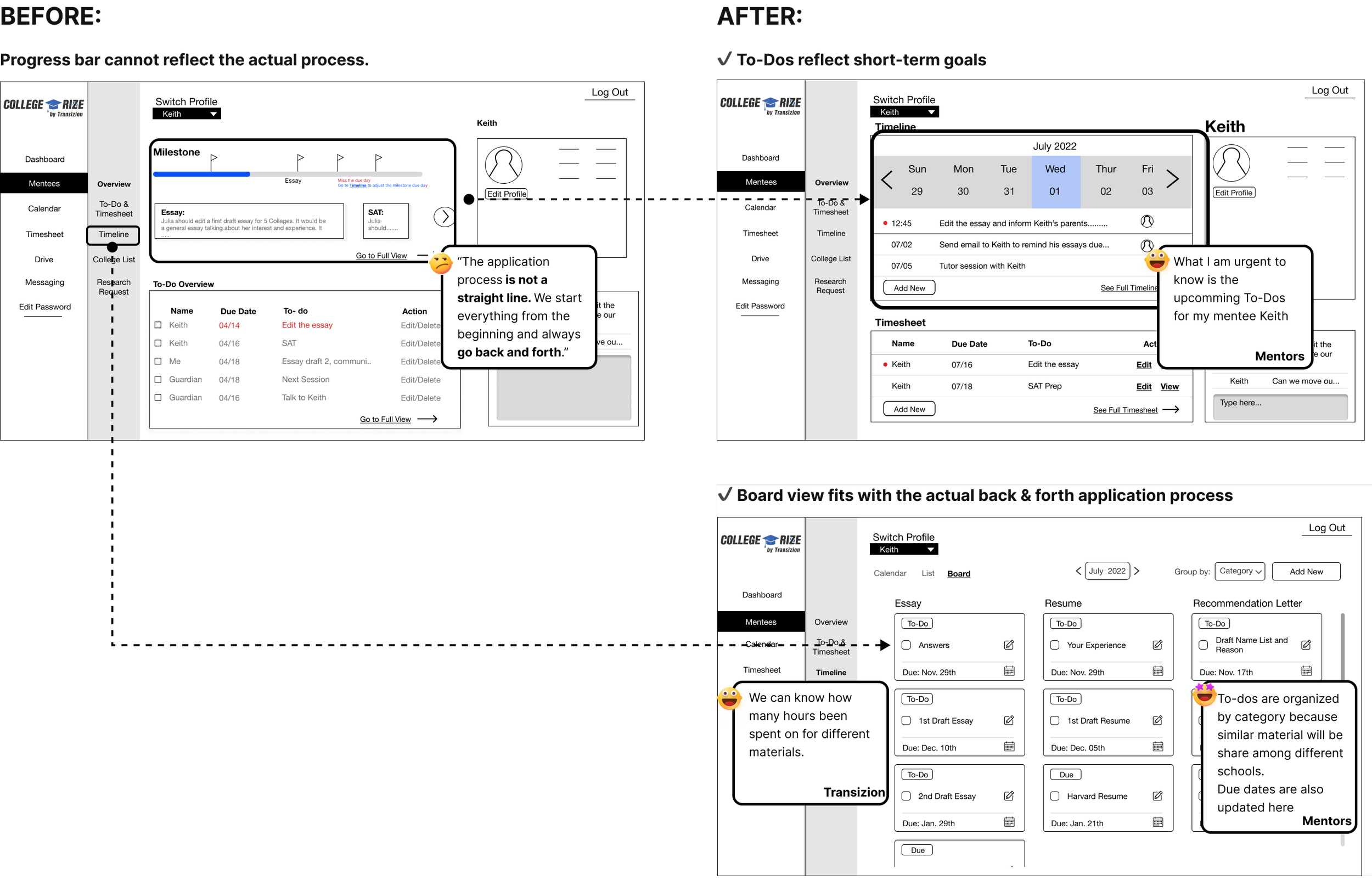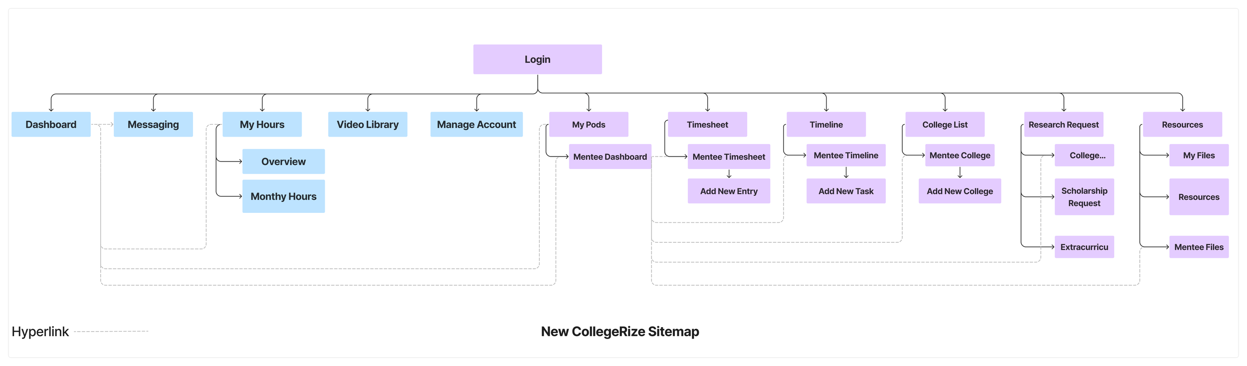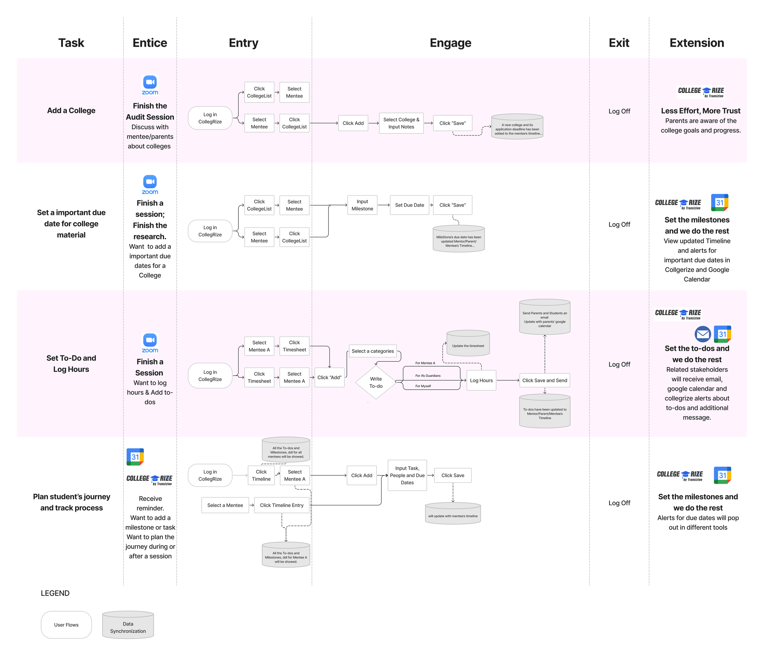 To deal with business goals and user goals, I mapped out the detailed user flow to explore how it increases mentors’ usage in CollegeRize while offloading their workload out of the meeting sessions.