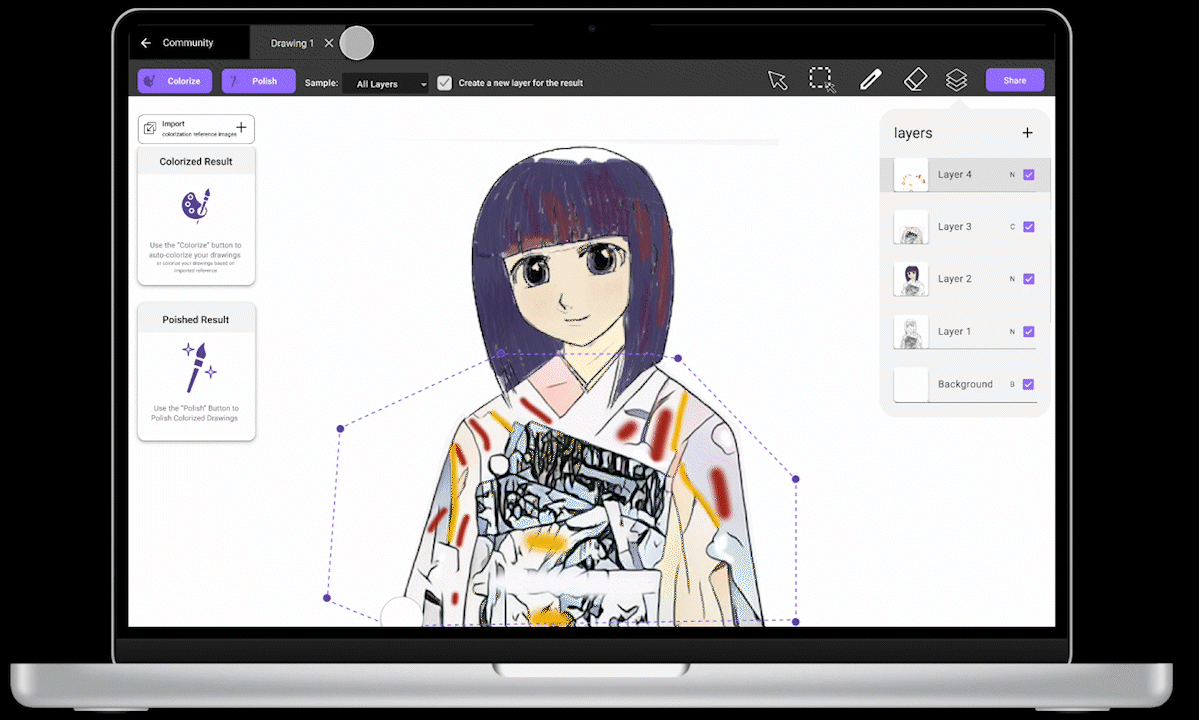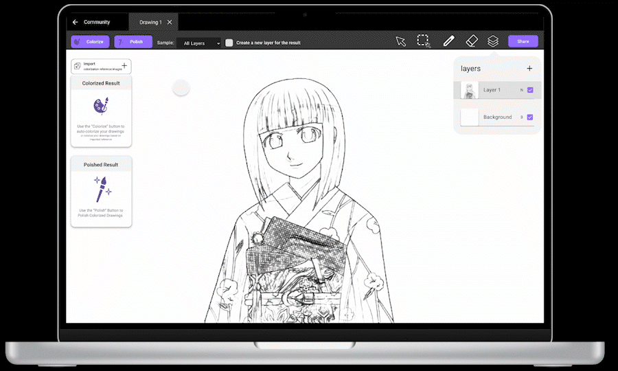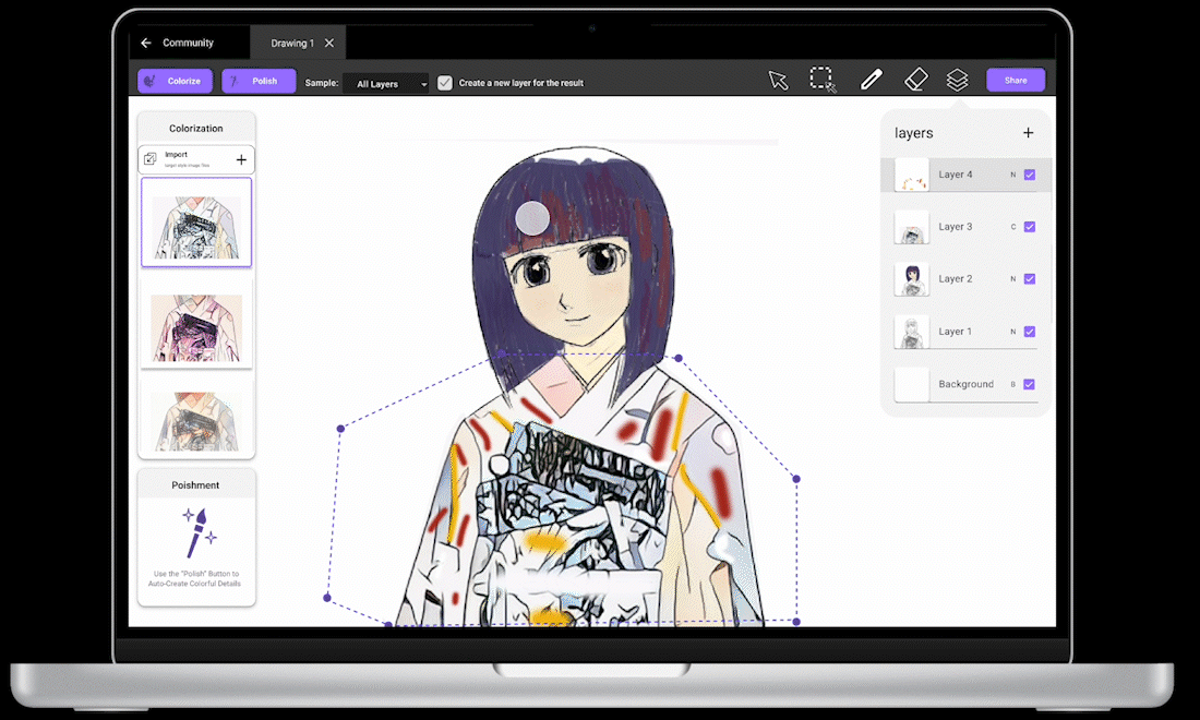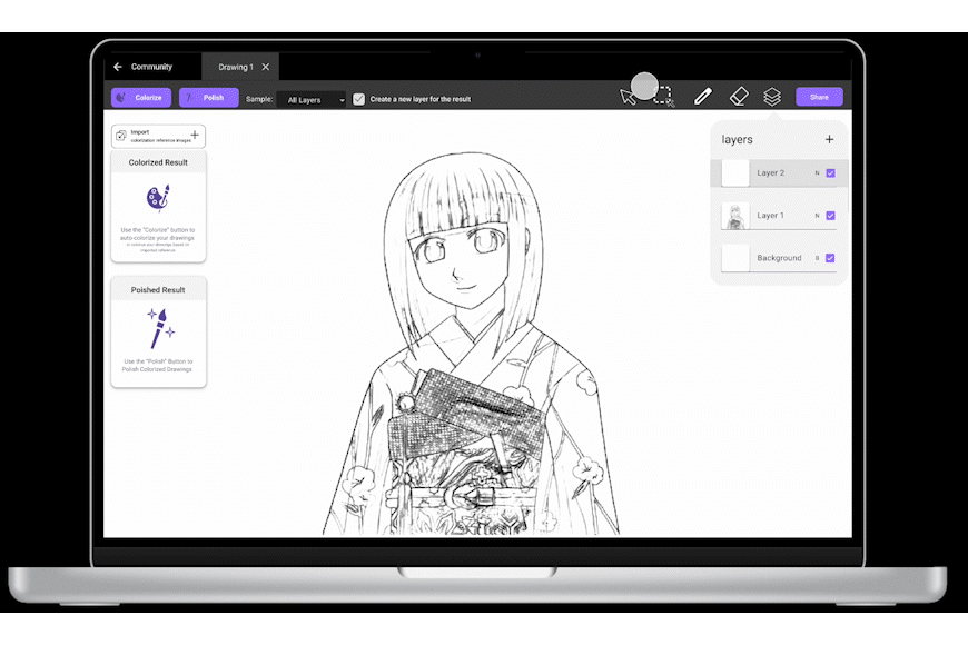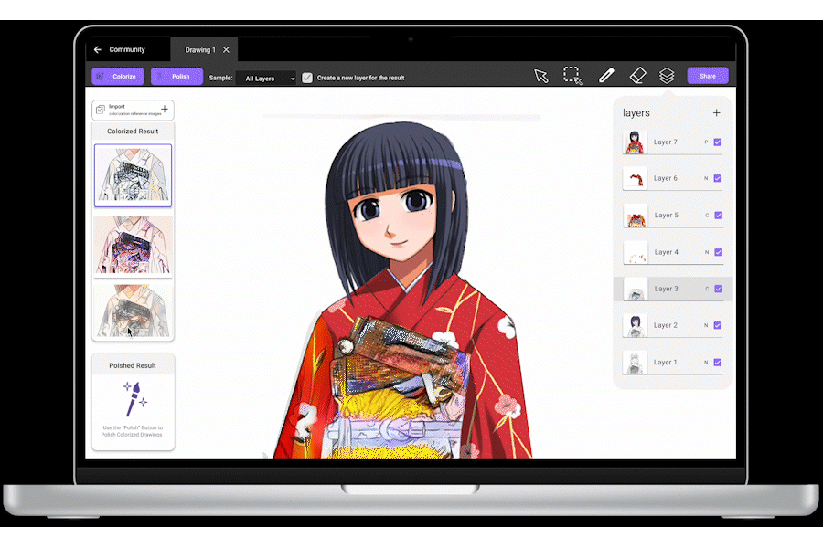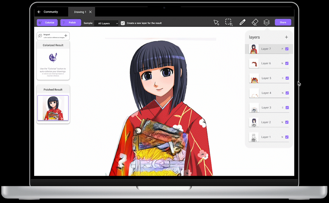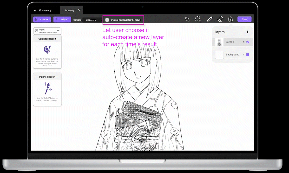Tie each layer with its colorization/polishment result menus and treat them independently. The former layer’s colorization menu will disappear when building a new layer.