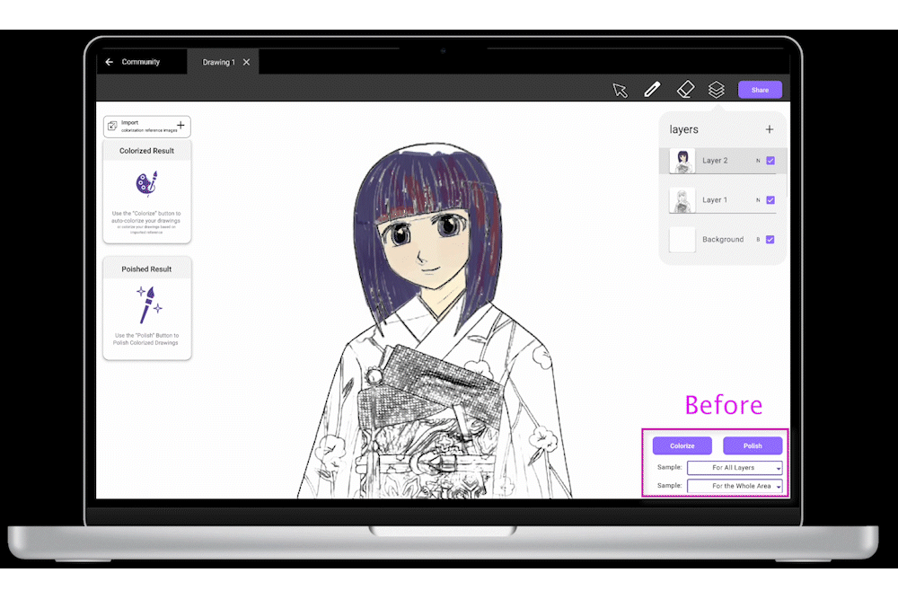 Tie each layer with its colorization/polishment result menus. The left colorization/ polishment result menu is tied with the selected layer. When going back to the former layers, the left menu will change based on the selected layer.